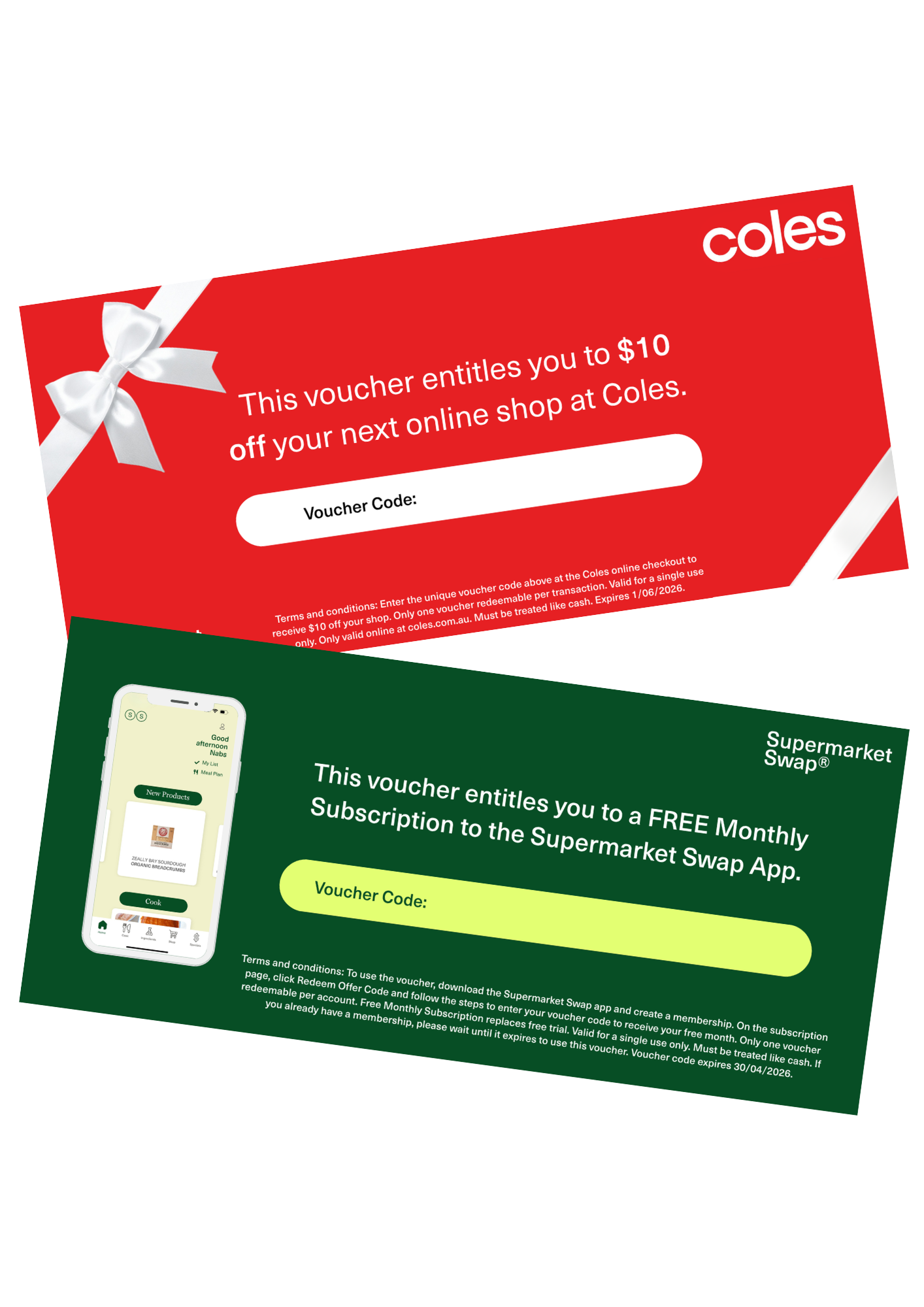 This bundle includes one $10 Coles Online voucher and one Supermarket Swap app voucher for a free month of membership. Both vouchers are single-use and must be treated like cash. The Coles voucher is valid for Coles Online orders only and expires 1 June 2026. The app voucher replaces the free trial, renews automatically at standard pricing after the free month unless cancelled, and expires 30 April 2026. Full voucher terms apply and can be viewed here. Lost or expired vouchers cannot be replaced.